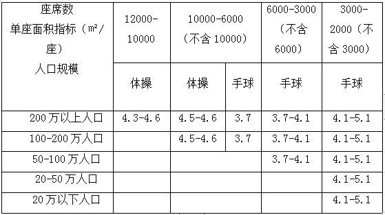 注:1.体育馆坐席为6000人时,分别按体操和手球计算单座建筑面积。
